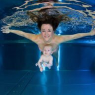 Bright-coloured swimsuits work best for underwater photos. Avoid busy patterns or logos. Babies are required to wear a double nappy system and eventually a swimming costume over it – just as they would wear in baby swimming classes.